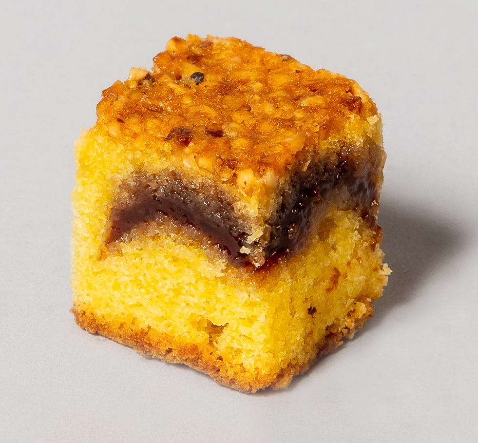 morbida torta alla vaniglia, farcita con marmellata alle fragole e granella di nocciole